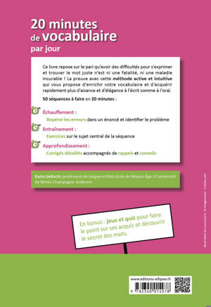 Ce livre repose sur le pari qu’avoir des difficultés pour s’exprimer et trouver le mot juste n’est ni une fatalité, ni une maladie incurable ! La preuve avec cette méthode active et intuitive qui vous propose d’enrichir votre vocabulaire et d’acquérir rapidement plus d’aisance et d’élégance à l’écrit comme à l’oral.