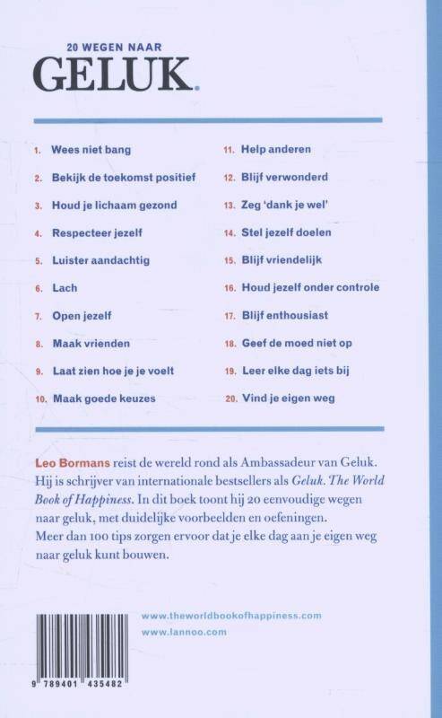 Toegankelijk instapboekje in de bekende geluksreeks Geluk is er voor iedereen. Meer nog, hoe meer we geluk met elkaar kunnen delen, hoe gelukkiger we worden. Daarom vatte Leo Bormans alle inzichten uit zijn boeken en lezingen als geluksambassadeur samen in een geluksboek voor elke lezer. Hij benoemde ? wegen om gelukkiger te worden, zoals: 'doelen stellen', 'dankbaar zijn' en - last but not least - 'niet bang zijn om gelukkig te willen worden'. Elk hoofdstukje heeft een heldere structuur: eerst een levensechte getuigenis. Daarna volgen de inzichten uit het geluksonderzoek, een moment van zelfre? ectie via een test en hoe je alles in de praktijk kunt brengen.