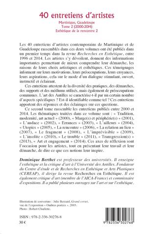Ces 40 entretiens d'artistes contemporains de Martinique et de Guadeloupe rassemblés dans ces deux volumes ont été réalisés entre 1996 et 2014. Les thématiques traitées dans ce second volume sont : « Tradition, modernité, art actuel » (2000), « Marge(s) et périphérie(s) » (2001), « L'audace » (2002), « Errances » (2003), « L'ailleurs » (2004), « Utopies » (2005), « La rencontre » (2006), « La relation au lieu » (2007), « Le fragment » (2008), « L'imprévisible » (2009), « L'insolite » (2010), « Le trouble » (2011), « Transgression(s) » (2013), « Art et engagement » (2014). Ces axes de réflexion sont l'occasion pour les artistes de dire ce que ces notions leur inspirent.