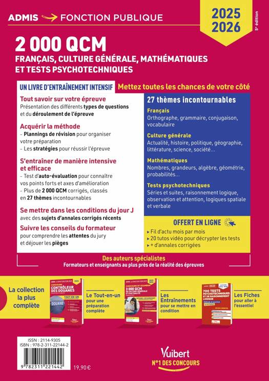 Ce livre vous permettra de réussir vos épreuves écrites de préadmissibilité en français, culture générale, mathématiques et tests psychotechniques aux concours de la fonction publique de catégories B et C. Il vous accompagnera également dans votre entraînement à toute épreuve de type QCM.