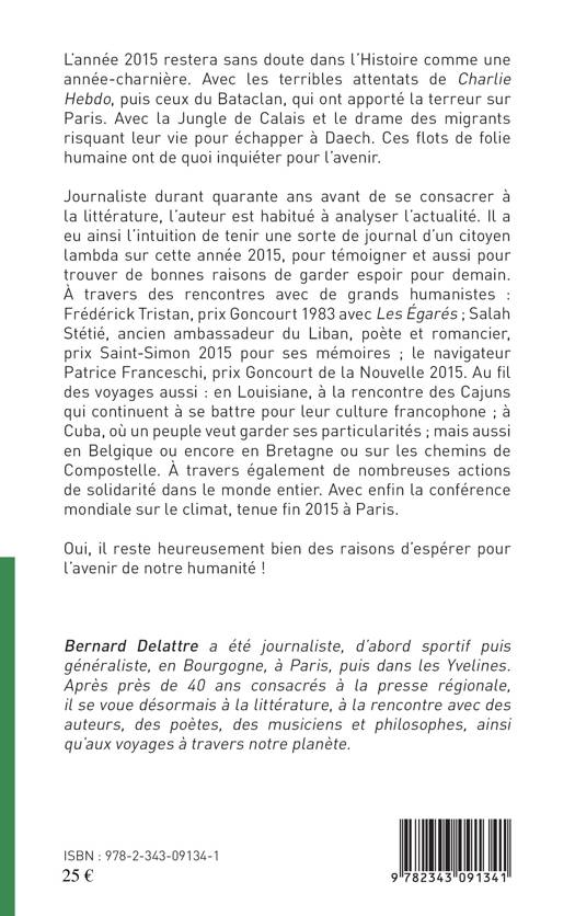 L'année 2015 restera sans doute dans l'Histoire comme une année-charnière. Avec les terribles attentats de Charlie Hebdo, puis ceux du Bataclan, qui ont apporté la terreur sur Paris. La Jungle de Calais et le drame des migrants. Ces flots de folie humaine ont de quoi inquiéter pour l'avenir. Journaliste durant quarante ans avant de se consacrer à la littérature, l'auteur est habitué à analyser l'actualité. Il a ainsi l'intuition de tenir une sorte de journal d'un citoyen lambda sur cette année 2015, pour témoigner et aussi pour trouver de bonnes raisons de garder espoir pour demain.