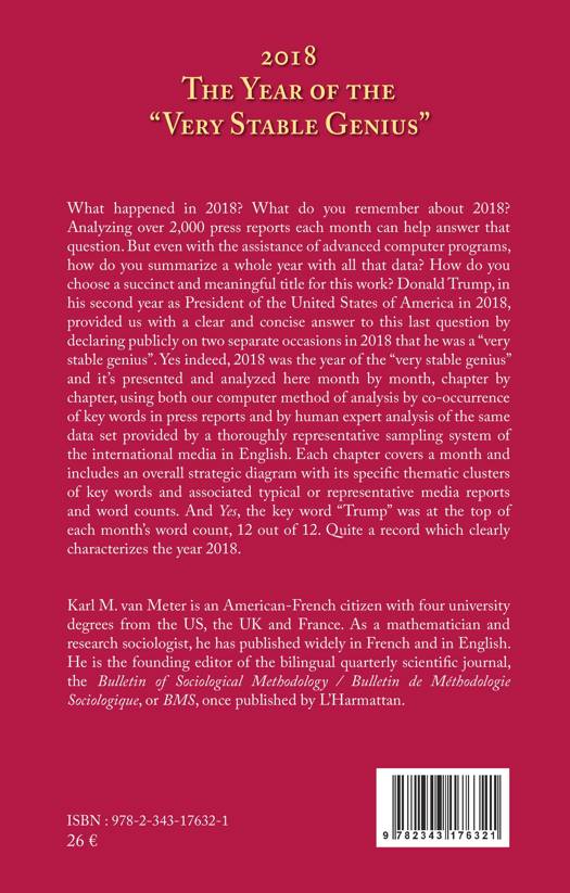 What happened in 2018 ? What do you remember about 2018 ? Analyzing over 2,000 press reports each month can help answer that question. But even with the assistance of advanced computer programs, how do you summarize a whole year with all that data ? How do you choose a succinct and meaningful title for this work ? Donald Trump, in his second year as President of the United States of America in 2018, provided us with a clear and concise answer to this last question by declaring publicly on two separate occasions in 2018 that he was a « very stable genius ». Yes indeed, 2018 was the year of the « very stable genius »