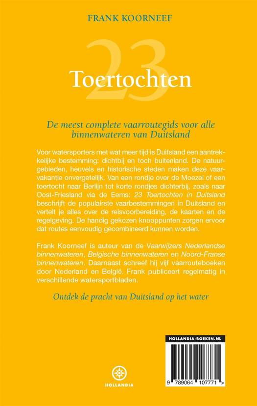 Ontdek Duitsland als vaarbestemming met '23 Toertochten in Duitsland' van Frank Koorneef. In deze nieuwe vaargids vind je verschillende prachtige vaartochten waardoor je de mooie natuurgebieden, heuvels en historische steden die Duitsland kent kunt verkennen. Maak een rondje over de Moezel of ga op toertocht naar Berlijn. Bezoek Oost-Friesland via de Eems of vaar naar de historische stad Bremen. Uiteraard ga je goed voorbereid op weg, want deze fijne gids bevat ook kaarten en informatie over regelgeving en reisvoorbereiding. In de reisgids '23 Toertochten in Duitsland' vind je de populairste vaarbestemmingen in Duitsland en kun je eindelijk jouw ultieme toertocht naar Duitsland plannen.
