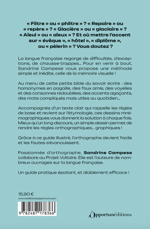 La langue française regorge de difficultés, d’exceptions, de chausse-trappes… Pour en venir à bout, Sandrine Campese nous propose une méthode simple et inédite, celle de la mémoire visuelle ! Au menu de cette petite bible du savoir écrire : des homonymes en pagaille, des faux amis très très proches, des voyelles et des consonnes redoublées, des accents agaçants, des mots compliqués mais utiles au quotidien… Accompagnés d’un texte clair qui rappelle les règles de base et revient sur l’étymologie, ces dessins mnémographiques vous donnent la solution à chaque fois. Mieux qu’un long discours, un simple dessin permet de rendre les règles orthographiques… graphiques ! Grâce à ce guide illustré, l’orthographe devient facile et les fautes s’évanouissent…"