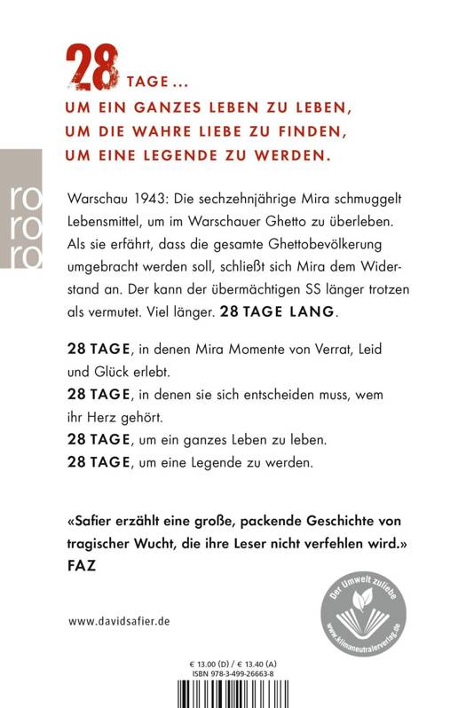 Warschau 1943: Die sechzehnjährige Mira schmuggelt Lebensmittel, um im Warschauer Ghetto zu überleben. Als sie erfährt, dass die gesamte Ghettobevölkerung umgebracht werden soll, schließt sich Mira dem Widerstand an. Der kann der übermächtigen SS länger trotzen als vermutet. Viel länger. 28 Tage lang.