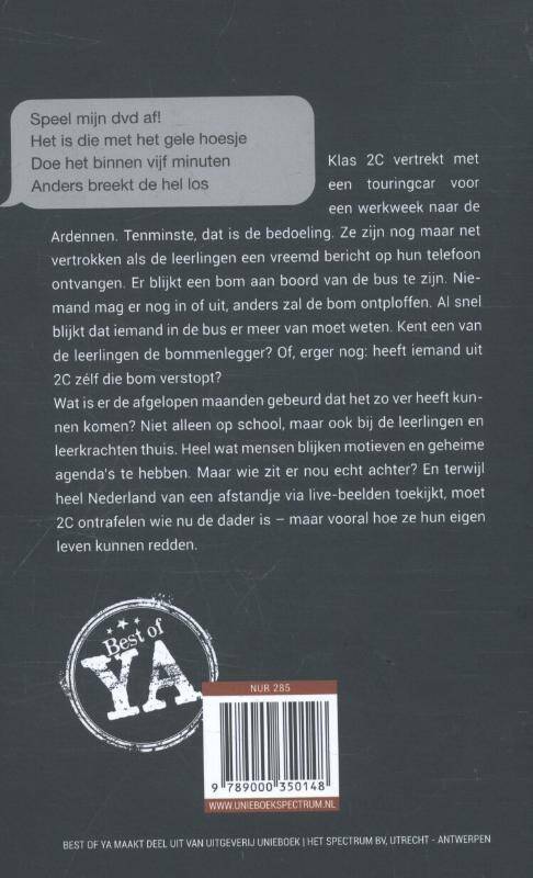 Klas 2C vertrekt met een touringcar voor een werkweek naar de Ardennen. Tenminste, dat is de bedoeling. Ze zijn nog maar net vertrokken als de leerlingen een vreemd bericht op hun telefoon ontvangen. Er blijkt een bom aan boord van de bus te zijn. Niemand mag er nog in of uit, anders zal de bom ontploffen. Al snel blijkt dat iemand in de bus er meer van moet weten. Kent een van de leerlingen de bommenlegger? Of, erger nog: heeft iemand uit 2C zélf die bom verstopt?