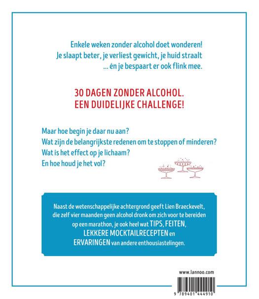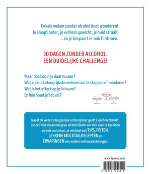 Enkele weken zonder alcohol doet wonderen! Je slaapt beter, je verliest gewicht, je huid straalt... én je bespaart er ook flink mee. 30 dagen zonder alcohol. Een duidelijke challenge! Maar hoe begin je daar nu aan? Wat zijn de belangrijkste redenen om te stoppen of te minderen? Wat is het effect op je lichaam? En hoe houd je het vol? Naast de wetenschappelijke achtergrond geeft Lien Braeckevelt, die zelf vier maanden geen alcohol dronk om zich voor te bereiden op een marathon, je ook heel wat tips, feiten, lekkere mocktailrecepten en ervaringen van andere enthousiastelingen.