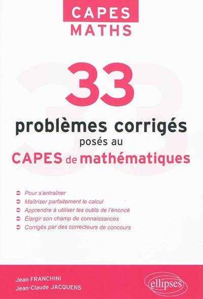 Ce livre contient les énoncés et corrigés de 33 problèmes posés au CAPES externe de mathématiques entre 1996 et 2011.