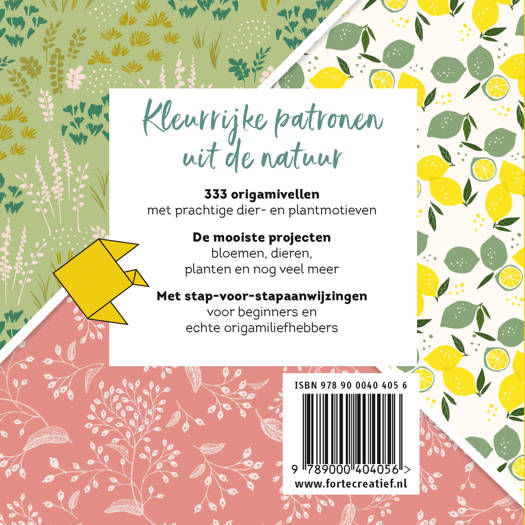 Origami-vouwen is een meditatieve bezigheid die je rust kan geven in een hectisch bestaan. In dit sfeervolle origamiblokboekje (maar liefst 4 centimeter dik!) vind je de basisprincipes van het vouwen, 10 leuke vouwpatroontjes met het thema natuur en niet minder dan 333 prachtige origamipapiertjes met blaadjes, bloemen en takjes en fruitpatronen.