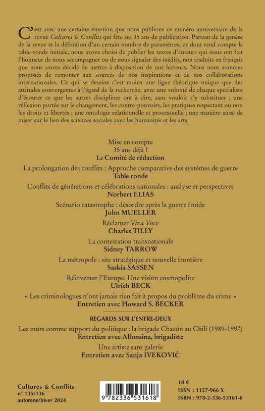 C'est avec une certaine émotion que nous publions ce numéro anniversaire de la revue Cultures & Conflits qui fête ses 35 ans de publication. Partant de la genèse de la revue et la définition d'un certain nombre de paramètres, ce dont rend compte la table-ronde initiale, nous avons choisi de publier les textes d'auteurs qui nous ont fait l'honneur de nous accompagner ou de nous signaler des inédits, non traduits en français que nous avons décidé de mettre à disposition de nos lecteurs. Nous nous sommes proposés de remonter aux sources de nos inspirations et de nos collaborations internationales. Ce qui se dessine c'est moins une ligne théorique unique que des attitudes convergentes à l'égard de la recherche, avec une volonté de chaque spécialiste d'écouter ce que les autres disciplines ont à dire, sans vouloir s'y substituer; une réflexion portée sur le changement, les contre-pouvoirs, les pratiques respectant ou non les droits et libertés; une ontologie relationnelle et processuelle; une manière aussi de miser sur le lien des sciences sociales avec les humanités et les arts.