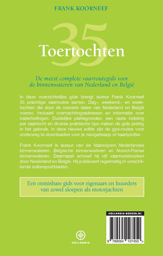 In '35 Toertochten voor motorboot en sloep' beschrijft Frank Koorneef op overzichtelijke wijze 35 bijzondere vaartochten door Nederland en België. Door de heldere plattegronden, vaste indeling per vaartocht en praktische tips is deze gids een echte publieksfavoriet. De vaartochten zijn geschikt voor dagtochten en meerdaagse tochten van verschillende lengte. Een onmisbare gids aan boord van elke motorboot en sloep. In deze nieuwe editie van '35 Toertochten voor motorboot en sloep' zijn de gps-routes voor onderweg te downloaden voor je navigatie-app of kaartplotter. Deze kun je vinden via www.hollandia-boeken.nl.