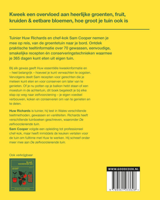 Tuinier Huw Richards en chef-kok Sam Cooper nemen je mee op reis, van de groentetuin naar je bord. Ontdek praktische teeltinformatie over 70 gewassen, eenvoudige, smakelijke recepten én conserveringstechnieken waarmee je 365 dagen kunt eten uit eigen tuin.