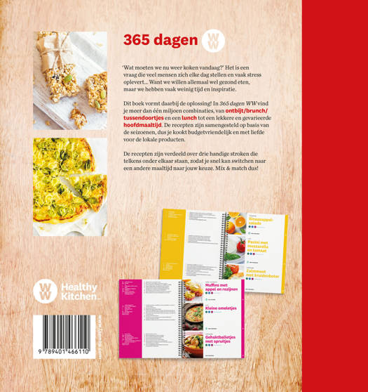 Slank af op de manier die het best bij jou past 'Wat moeten we nu weer koken vandaag?' Dit boek vormt de oplossing! In 365 dagen WW vind je 366 recepten, verdeeld over ontbijt/brunch/tussendoortjes, lunch en een lekkere en gevarieerde hoofdmaaltijd. De recepten zijn samengesteld op basis van de seizoenen en verdeeld over drie stroken die telkens onder elkaar staan. Je kunt de stroken zeer gemakkelijk wisselen van plaats waardoor je elke dag een nieuw dagmenu hebt. Mix & Match dus!