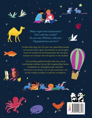 Waar regent het diamanten?Hoe ruikt de ruimte?En wie was William Johnson Hippopotamus precies? Ontdek élke dag van het jaar een geweldig weetje, van bomen die in glas veranderen en de langste worst ter wereld tot dromedarissen die het gras maaien en mensen die licht geven in het donker! Dit prachtig geïllustreerde boek voor op je nachtkastje trakteert je op 365 ongelooflijke feiten, anekdotes en waargebeurde verhalen. Dommel in en droom van al die avonturen, om bij het wakker worden er zelf een te beleven.