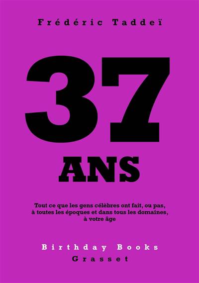 Tout ce que les gens célèbres ont fait, ou pas, à toutes les époques et dans tous les domaines, à votre âge.« L’âge est un quartier de la vie que l’on habite tous ensemble, même si ce n’est pas au même moment. Plusieurs siècles séparent Bob Dylan, Marie de Médicis, Gandhi, Janet Jackson et Charles Ponzi, mais ici ils ont 37 ans tous les cinq : le premier est chrétien évangélique, sa voisine gouverne la France, le troisième prononce son vœu de chasteté, la suivante fait scandale pendant la finale du Super Bowl, le dernier invente « la pyramide de Ponzi ». Le succès n’a pas d’âge, les catastrophes non plus. A 37 ans, on peut devenir le cardinal de Richelieu ou Laurence Pernoud, Bernard Tapie ou Blanche Gardin. Mais la case prison est également bien remplie: on y trouve Louis XVI, Al Capone, le futur empereur Napoléon III, Ulrike Meinhoff, Jérôme Kerviel, Florence Cassez, le boxeur Christophe Dettinger, il y a même Alfred Dreyfus, tout seul, sur l’île du Diable… Comme chaque quartier, celui-ci se trouve à la croisée des chemins. »