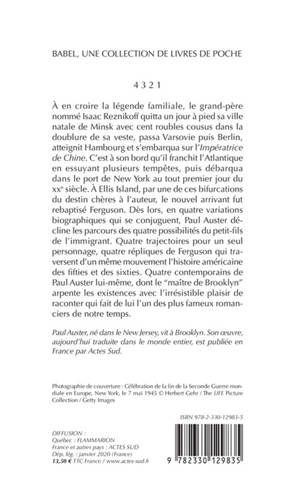 À en croire la légende familiale, le grand-père nommé Isaac Reznikoff quitta un jour à pied sa ville natale de Minsk avec cent roubles cousus dans la doublure de sa veste, passa Varsovie puis Berlin, atteignit Hambourg et s'embarqua sur l'«Impératrice» «de Chine». C'est à son bord qu'il franchit l'Atlantique en essuyant plusieurs tempêtes, puis débarqua dans le port de New York au tout premier jour du XXe siècle. À Ellis Island, par une de ces bifurcations du destin chères à l'auteur, le nouvel arrivant fut rebaptisé Ferguson. Dès lors, en quatre variations biographiques qui se conjuguent, Paul Auster décline les parcours des quatre possibilités du petit-fils de l'immigrant. Quatre trajectoires pour un seul personnage, quatre répliques de Ferguson qui traversent d'un même mouvement l'histoire américaine des fifties et des sixties. Quatre contemporains de Paul Auster lui-même, dont le "maître de Brooklyn" arpente les existences avec l'irrésistible plaisir de raconter qui fait de lui l'un des plus fameux romanciers de notre temps.