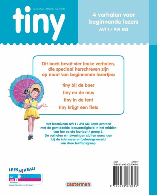 Dit boek bevat vier leuke verhalen,die speciaal herschreven zijnop maat van beginnende lezertjes:tiny bij de boertiny en de mustiny in de tenttiny krijgt een fietsHet leesniveau AVI 1 / AVI M3 komt overeenmet de gemiddelde leesvaardigheid in het middenvan het eerste leerjaar / groep 3.De verhalen en tekeningen sluiten nauw aanbij de interesses en belevingswereldvan deze leeftijdsgroep.