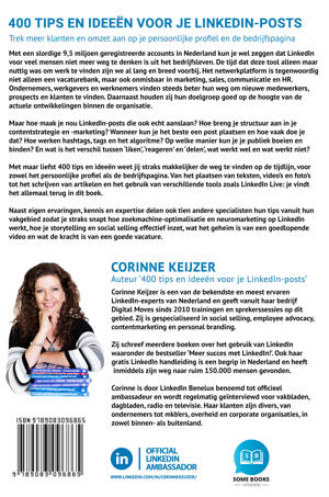 Met maar liefst 400 tips en ideeën weet jij straks makkelijker de weg te vinden op de tijdlijn, voor zowel het persoonlijke profiel als de bedrijfspagina. Van het plaatsen van teksten, video’s en foto’s tot het schrijven van artikelen en het gebruik van verschillende tools zoals LinkedIn Live: je vindt het allemaal terug in dit boek.