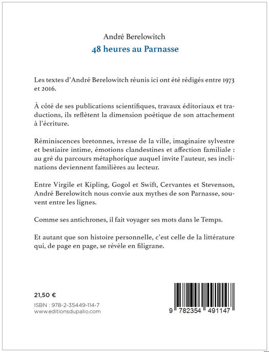 Les textes d’André Berelowitch réunis ici ont été rédigés entre 1973 et 2016.<br /><br /> À côté de ses publications scientifiques, travaux éditoriaux et traductions, ils reflètent la dimension poétique de son attachement à l’écriture.<br /><br /> Réminiscences bretonnes, ivresse de la ville, imaginaire sylvestre et bestiaire intime, émotions clandestines et affection familiale : au gré du parcours métaphorique auquel invite l’auteur, ses inclinations deviennent familières au lecteur.<br /><br /> Entre Virgile et Kipling, Gogol et Swift, Cervantes et Stevenson, André Berelowitch nous convie aux mythes de son Parnasse, souvent entre les lignes.<br /><br /> Comme ses antichrones, il fait voyager ses mots dans le Temps.<br /><br /> Et autant que son histoire personnelle, c’est celle de la littérature qui, de page en page, se révèle en filigrane.<br /><br /> Ancien élève de l’École normale supérieure, André Berelowitch est historien. Parallèlement à ses activités de recherche et enseignement, il a écrit des poèmes de circonstance, des nouvelles, commencé des romans et tenu pour lui-même des carnets, d’où surgissent poèmes et prose.<br />