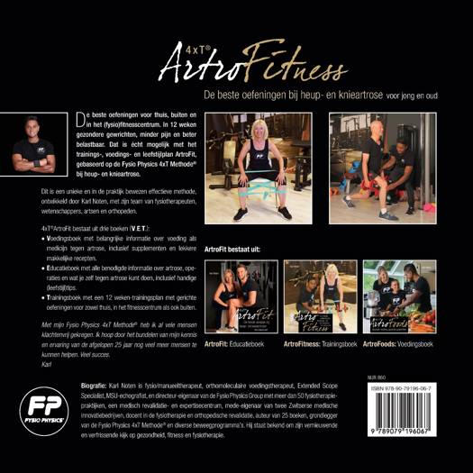 De beste oefeningen voor thuis, buiten en in het (fysio)fitnesscentrum. In 12 weken gezondere gewrichten, minder pijn en -beter belastbaar. Dat is écht mogelijk met het -trainings-, voedings- en leefstijlplan ArtroFit, gebaseerd op de Fysio Physics 4xT Methode® bij heup- en knie-artrose. Dit is een unieke en in de praktijk bewezen -effectieve methode, ontwikkeld door Karl Noten, met zijn team van fysiotherapeuten, wetenschappers, artsen en ortho-peden. 4xT®ArtroFit bestaat uit drie boeken (V.E.T.):