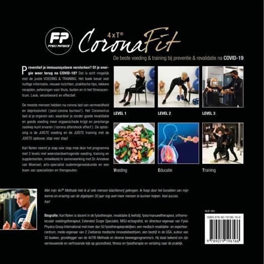 4xT® CoronaFit De beste voeding & training bij preventie & revalidatie na COVID-19 Preventief je immuunsysteem versterken, weer meer energie en snel revalideren na COVID-19? Dat is echt mogelijk met de juiste VOEDING & TRAINING. Het boek bevat veel nuttige informatie, nieuwe inzichten, praktische tips, lekkere recepten, oefeningen voor thuis, buiten en in het fitnesscentrum. Leuk, verantwoord en effectief. De meeste mensen hebben na corona last van vermoeidheid en depressiviteit (‘post-corona burnout’). Het Coronavirus tast al je organen aan, waardoor je zonder goede revalidatie en goede voeding meer orgaanschade krijgt en jarenlange nasleep kunt ervaren (‘corona aftershock effect’). De oplossing is de JUISTE voeding en de JUISTE training met de JUISTE opbouw, stap voor stap! Karl Noten neemt je stap voor stap mee door het programma met 3 levels met weerstandverhogende voeding, training en supplementen, ontwikkeld in samenwerking met Dr. Annekee van Woensel, arts-specialist ouderengeneeskunde en een team van specialisten en therapeuten. Biografie: Karl Noten is docent in de fysiotherapie, revalidatie & leefstijl, fysio/manueeltherapeut, orthomoleculair voedingstherapeut, Extended Scope Specialist, MSU-echografist, en directeur-eigenaar van Fysio Physics Group International met meer dan 50 fysiotherapiepraktijken, een medisch revalidatie- en expertisecentrum, mede-eigenaar van 2 Zwitserse medische innovatiebedrijven, een bedrijf in de USA, auteur van 30 boeken, grondlegger van de 4xT® Methode en diverse beweegprogramma’s. Hij staat bekend om zijn vernieuwende en verfrissende kijk op gezondheid, fitness en fysiotherapie en vertaling naar de praktijk.