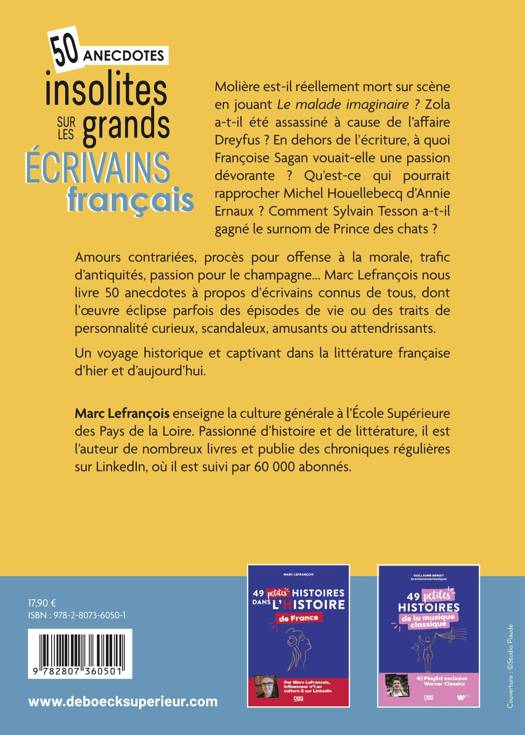 Amours contrariées, procès pour offense à la morale, trafic d’antiquités, passion pour le champagne… Marc Lefrançois nous livre 50 anecdotes à propos d’écrivains connus de tous, dont l’oeuvre éclipse parfois des épisodes de vie ou des traits de personnalité curieux, scandaleux, amusants ou attendrissants.