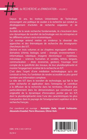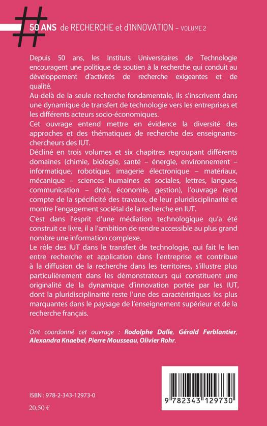 Cet ouvrage entend mettre en évidence la diversité des approches et des thématiques de recherche des enseignants-chercheurs des IUT. Décliné en trois volumes et six chapitres regroupant différents domaines (chimie, biologie, santé - énergie, environnement - informatique, robotique, imagerie électronique - matériaux, mécanique - sciences humaines et sociales, lettre, langues, communication - droit, économie, gestion), l’ouvrage rend compte de la spécificité des travaux, de leur pluridisciplinarité et montre l’engagement sociétal de la recherche en IUT.