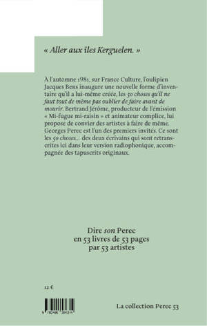 À l’automne 1981, sur France Culture, l’oulipien Jacques Bens inaugure une nouvelle forme d’inventaire qu’il a lui-même créée, les "50 choses qu’il ne faut tout de même pas oublier de faire avant de mourir". Bertrand Jérôme, producteur de l’émission « Mi-fugue mi-raisin » et animateur complice, lui propose de convier des artistes à faire de même. Georges Perec est l’un des premiers invités. Ce sont les "50 choses..". des deux écrivains qui sont retranscrites ici dans leur version radiophonique, accompagnée des tapuscrits originaux.