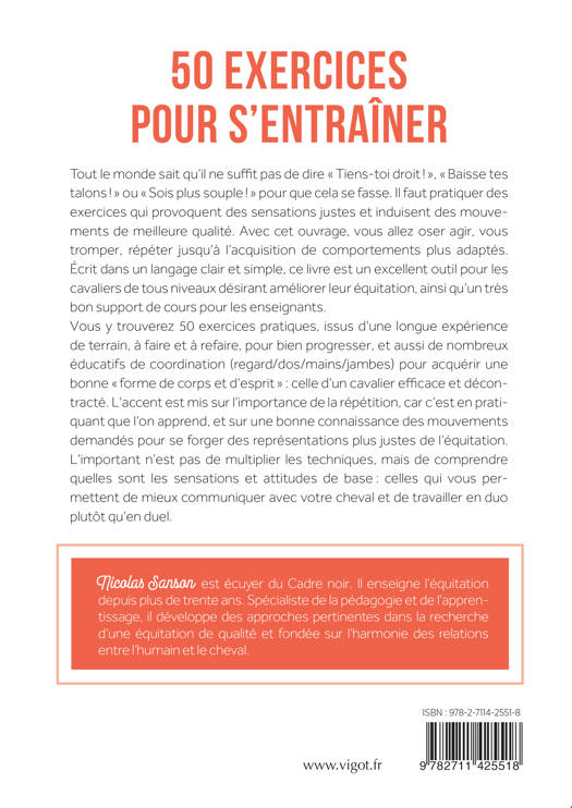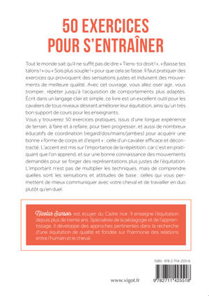 Vous y trouverez 50 exercices pratiques, issus d’une longue expérience de terrain, à faire et à refaire, pour bien progresser, et aussi de nombreux éducatifs de coordination (regard/dos/mains/jambes) pour acquérir une bonne « forme de corps et d’esprit » : celle d’un cavalier efficace et décontracté. L’accent est mis sur l’importance de la répétition, car c’est en pratiquant que l’on apprend, et sur une bonne connaissance des mouvements demandés pour se forger des représentations plus justes de l’équitation. L’important n’est pas de multiplier les techniques, mais de comprendre quelles sont les sensations et attitudes de base : celles qui vous permettent de mieux communiquer avec votre cheval et de travailler en duo plutôt qu’en duel.