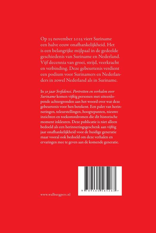 In '50 jaar Srefidensi. Portretten en verhalen over Suriname' komen vijftig personen met uiteenlopende achtergronden aan het woord over wat deze gebeurtenis voor hen betekent. Een palet van herinneringen, teleurstellingen, hoogtepunten, nieuwe inzichten en toekomstdromen die dit historische moment inkleuren. Deze publicatie is niet alleen bedoeld als een herinneringsgeschenk aan vijftig jaar onafhankelijkheid voor de huidige generatie maar vooral ook bedoeld om deze verhalen en ervaringen mee te geven aan de komende generatie.