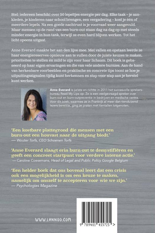 Stel: iedereen beschikt over 50 lepeltjes energie per dag. Elke taak - je aankleden, je kinderen naar school brengen, een vergadering - kost je één of meerdere lepels. Na een goede nachtrust is je voorraad weer aangevuld. Maar mensen op de rand van een burn-out staan dag na dag op met steeds minder energie in hun tank, terwijl ze even hard blijven werken. Tot het licht opeens uitgaat. Anne Everard maakte het aan den lijve mee. Met vallen en opstaan leerde ze haar energiereserves opnieuw aan te vullen door de juiste keuzes te maken, prioriteiten te stellen én mild te zijn voor haar lichaam. Dit boek is gebaseerd op haar eigen ervaringen en die van vele andere burnies. Aan de hand van herkenbare voorbeelden en praktische en concrete tips toont ze hoe je uitputtingssignalen tijdig kunt herkennen en stap voor stap aan je herstel kunt werken.