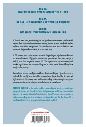 In 50 lessen voor ondernemers onthult Jürgen Ingels zijn lessons learned als topondernemer. Hij geeft concrete en praktische tips over hoe je je bedrijf naar het volgende niveau tilt. Van operations tot businessmodel, marketing en sales, de samenstelling van je team, en de financiële opbouw van je onderneming.