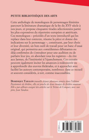 Cette anthologie de monologues de personnages féminins parcourt la littérature dramatique de la fin du XVIe siècle à nos jours, et propose cinquante tirades sélectionnées parmi les plus expressives du répertoire européen et américain. Ces monologues – précédés d'un texte introductif qui les replace dans leur contexte, résume la pièce et donne des indications sur le personnage –, constituent, par leur choix et leur diversité, un bon outil de travail pour un banc d'essai original, qui permettra aux comédiennes débutantes ou déjà confirmées de s'entraîner pour une audition ou de parfaire leur jeu, en abordant tous les registres – du rire aux larmes, de l'intériorité à l'épanchement. Ces extraits peuvent également inciter les amateurs à redécouvrir ou à approfondir des oeuvres théâtrales, et à approcher avec facilité les auteurs contemporains, nombreux dans ce recueil et souvent considérés, à tort, comme inaccessibles.