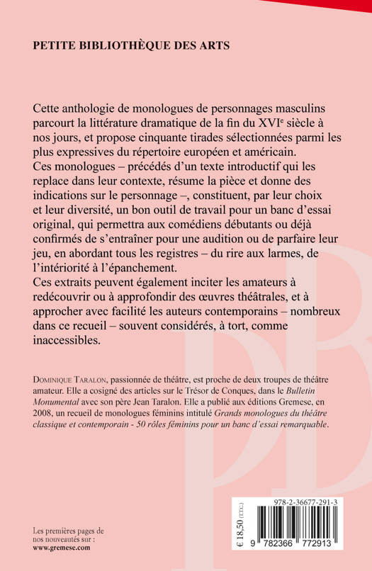 Cette anthologie de monologues de personnages masculins parcourt la littérature dramatique de la fin du XVIe siècle à nos jours, et propose cinquante tirades sélectionnées parmi les plus expressives du répertoire européen et américain. Ces monologues – précédés d'un texte introductif qui les replace dans leur contexte, résume la pièce et donne des indications sur le personnage –, constituent, par leur choix et leur diversité, un bon outil de travail pour un banc d'essai original, qui permettra aux comédiens débutants ou déjà confirmés de s'entraîner pour une audition ou de parfaire leur jeu, en abordant tous les registres – du rire aux larmes, de l'intériorité à l'épanchement. Ces extraits peuvent également inciter les amateurs à redécouvrir ou à approfondir des oeuvres théâtrales, et à approcher avec facilité les auteurs contemporains, nombreux dans ce recueil et souvent considérés, à tort, comme inaccessibles.