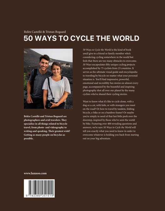 50 Ways encapsulates 50 unique cycling projects accomplished by 75 cyclists from 23 countries. It serves as the ultimate visual guide and encyclopedia to traveling by bicycle no matter what your personal situation is. You'll find impressive, powerful, emotional and incredibly fun stories on almost every page, accompanied by the beautiful and inspiring photography shot all over our planet by the many cyclists who've shared their cycling stories.