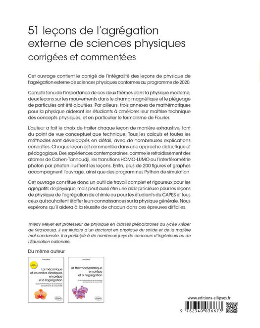 Cet ouvrage constitue donc un outil de travail complet et rigoureux pour les agrégatifs de physique mais peut aussi être une aide précieuse pour les leçons de physique de l’agrégation de chimie ou pour les étudiants du CAPES et tous ceux qui souhaitent étoffer leurs connaissances sur la physique générale.