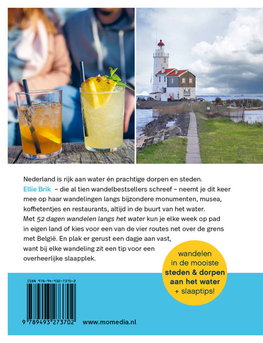 Wandelen in de mooiste steden & dorpen aan het water Nederland is rijk aan water én prachtige dorpen en steden. Ellie Brik – die al tien wandelbestsellers schreef – neemt je dit keer mee op haar wandelingen langs bijzondere monumenten, musea, koffietentjes en restaurants, altijd in de buurt van het water. Met 52 dagen wandelen langs het water kun je elke week op pad in eigen land of kies voor een van de vier routes net over de grens met België. En plak er gerust een dagje aan vast, want bij elke wandeling zit een tip voor een overheerlijke slaapplek