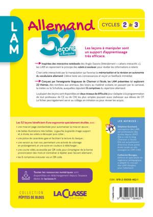 Inspirées des interactive notebooks des Anglo-Saxons, les leçons à manipuler en reprennent le principe des volets à soulever, pour révéler les informations à retenir. Un système particulièrement efficace pour l’apprentissage et la révision en autonomie du vocabulaire allemand. Créées sur le modèle des LAM d’anglais de l’enseignante blogueuse Charivari, les 52 LAM d’allemand présentées ici bénéficient d’une ergonomie spécialement étudiée pour les élèves de CP, CE et CM, d’une mise en page animée de chouettes illustrations très lisibles (à gauche, la grande illustration support ; à droite, les volets à découper et à coller sur le support), et, pour la plupart des thèmes, de 2 niveaux de difficulté pour s’adapter à la programmation de chaque classe. Une vingtaine de thèmes sont ainsi étudiés : des nombres aux pièces de la maison, des nombres aux animaux, des loisirs au matériel scolaire, en passant par la météo, le carnaval ou la Schultüte, sans oublier quelques comptines. À télécharger depuis l’espace dédié de LaClasse.fr, les LAM sont disponibles à la fois au trait noir – pour une activité coloriage en prolongement – et en couleurs. En bonus, des QR codes intégrés aux LAM mènent à de courtes vidéos permettant à l’élève d’écouter la bonne prononciation des mots. Pratique pour s’entraîner à répéter avec le vrai accent germanique depuis n’importe où.