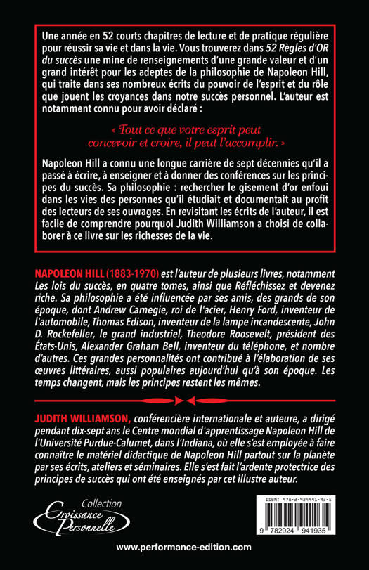 Une année en 52 courts chapitres de lecture et de pratique régulière pour réussir sa vie et dans la vie. Vous trouverez dans « 52 Règles d’Or du succès » une mine de renseignements d’une grande valeur et d’un grand intérêt pour les adeptes de la philosophie de Napoleon Hill, qui traite dans ses nombreux écrits du pouvoir de l’esprit et du rôle que jouent les croyances dans notre succès personnel. L’auteur est notamment connu pour avoir déclaré : « Tout ce que votre esprit peut concevoir et croire, il peut l’accomplir. » Napoleon Hill a connu une longue carrière de sept décennies qu’il a passé à écrire, à enseigner et à donner des conférences sur les principes du succès. Sa philosophie : rechercher le gisement d’or enfoui dans les vies des personnes qu’il étudiait et documentait au profit des lecteurs de ses ouvrages. En revisitant les écrits de l’auteur, il est facile de comprendre pourquoi Judith Williamson a choisi de collaborer à ce livre sur les richesses de la vie.