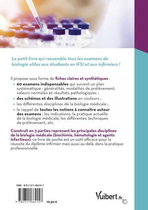Construit en 3 parties reprenant les principales disciplines de la biologie médicale (biochimie, hématologie, bactériologie), ce livre est un outil efficace pour la réussite du diplôme infirmier mais aussi au-delà, dans la pratique professionnelle.