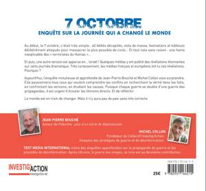 Au début le 7 octobre c’était très clair 40 bébés décapités viols de masse festivaliers et kibboutz délibérément attaqués pour massacrer le plus possible de civils Et tout cela sans raison une haine inexplicable des terroristes du Hamas Et puis une histoire très différente est apparue en Israël De nombreux médias y ont publié des révélations étonnantes sur cette journée dramatique Très curieusement nos médias ont tu ces révélations Pourquoi Aujourd’hui l’enquête minutieuse et approfondie de JeanPierre Bouché et Michel Collon vous surprendra Elle passionnera tous ceux qui veulent comprendre les conflits en recherchant la vérité dans les faits en confrontant les versions en étudiant les causes Puisque chaque guerre se double d’une guerre des propagandes il est urgent d’écouter les témoins directs Et de réfléchirIl n’y aura pas de paix sans une info correcte