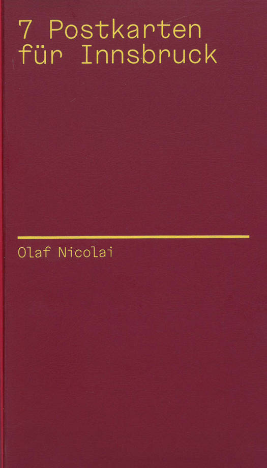 Im März 2016 wurde von Olaf Nicolai die Einzelausstellung 7 Postkarten für Innsbruck im barocken Palais Fugger-Taxis eröffnet, in dem sich bis ins frühe 20. Jahrhundert eine Poststation befand. Auf die Nutzung des Ortes, an dem Nachrichten und Botschaften verteilt wurden, nahm seine filmisch-skulpturale Arbeit Bezug. Über den Zeitraum der Ausstellung wurden in regelmäßigen Abständen sieben "sound postcards" nach Innsbruck geschickt. Ihre Absenderin war eine Sängerin, die sich von verschiedenen Orten ihrer Reise meldete. Als Notation für die Lieder dienten ihr sieben Fotos von Steinschnitten, die Nicolai für die Ausstellung gefertigt hatte und die in Innsbruck zu sehen waren. Im Verlauf der Ausstellung wurde jeder Song mit dem entsprechenden Bild in einer 35 mm-Filminstallation aufgeführt, sodass die Besucher über die Dauer der Ausstellung das Entstehen der Arbeit beobachten konnten. Die Publikation führt die musikalischen Botschaften im Medium Buch neu auf.