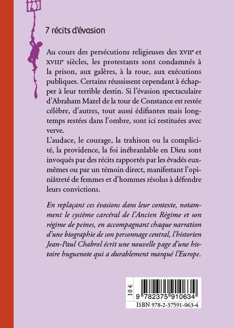 Au cours des persécutions religieuses des XVII et XVIII siècles, les protestants sont condamnés à la prison, aux galères, à la roue, aux exécutions publiques. Certains réussissent cependant à échapper à leur terrible destin. Si l'évasion spectaculaire d'Abraham Mazel de la tour de Constance est restée célèbre, d'autres, tout aussi édifiantes mais longtemps restées dans l'ombre, sont ici restituées avec verve. L'audace, le courage, la trahison ou la complicité, la providence, la foi inébranlable en Dieu sont invoqué par des récits apportés par les évadés eux-mêmes ou par témoin direct, manifestant l'opiniâtreté de femmes et d'homme résolus à défendre leurs convictions.