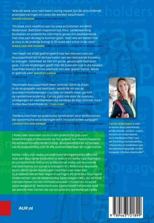 '7 Rollen voor duurzaam succes' is een praktische gids voor (toekomstige) professionals op het gebied van maatschappelijk verantwoord ondernemen (mvo), duurzaamheid en corporate social responsibility (csr) in alle soorten bedrijven en organisaties. Welke rollen zijn nodig om bedrijven en organisaties effectief naar een duurzame toekomst te leiden? En welke vaardigheden en competenties heb je als professional nodig om duurzame transformaties tot stand te brengen? In '7 Rollen voor duurzaam succes' deelt Carola Wijdoogen inzichten van meer dan 25 professionals en haar eigen ervaringen als directeur Duurzaam Ondernemen van de Nederlandse Spoorwegen (NS), die ze hielp transformeren tot een klimaatneutraal, circulair en inclusief spoorwegbedrijf; Nederland was bijvoorbeeld het eerste land ter wereld met treinen die op 100 procent windenergie rijden.