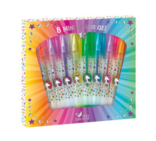 Boîte de 8 mini stylos gels à l'effigie des licornes. Taille d'un stylo : 8,5 cm.