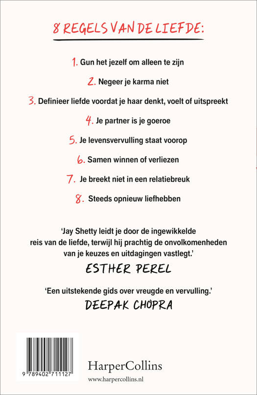 Socialmediasuperster Jay Shetty deelt met 8 regels van de liefde een alomvattende gids over de liefde, gebaseerd op oude wijsheden en moderne wetenschap. Je leert van alles in het leven, maar niemand leert je hoe je moet liefhebben. Jay Shetty – motivational speaker, socialmediasuperster en presentator van de #1 podcast On Purpose – gaat in dit onthullende boek in op de hele relatiecyclus, van eerste dates en samenwonen tot uit elkaar gaan en opnieuw beginnen. Op basis van oude wijsheden en de nieuwste wetenschappelijke inzichten laat Shetty zien welke regels de liefde volgt. Liefde is namelijk geen ingewikkeld concept of een verzameling van clichés, maar een vaardigheid die je aan de hand van praktische stappen kunt ontwikkelen, zoals hoe je samen alles kunt overwinnen of hoe je vrienden blijft als je relatie stukloopt. Door het naleven van de acht liefdesregels kan iedereen meer van zichzelf en de wereld om zich heen houden. Met warmte en helderheid begeleidt Jay Shetty je in dit boek naar een liefdevoller leven. 'Jay Shetty leidt lezers door de ingewikkelde reis van de liefde, terwijl hij prachtig de onvolkomenheden van onze keuzes en uitdagingen vastlegt.' Esther Perel 'Een uitstekende gids over vreugde en vervulling. De liefdesregels van Shetty nemen je mee op een pad dat je via zelfontdekking naar nieuwe niveaus van bewustzijn leidt – het enige middel voor gelukzalige relaties.' Deepak Chopra 'Een verfrissende kijk op liefde als dagelijkse bezigheid. Moeiteloos combineert Shetty spirituele wijsheden met down-to-earth adviezen, wat zorgt voor lessen die echt blijven hangen.' Publishers Weekly