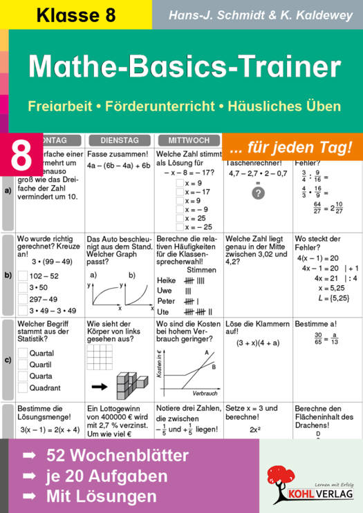 Unser Arbeitsheft für Mathematik in der Sekundarstufe Klasse 8 bietet eine umfangreiche Sammlung abwechslungsreicher Übungsaufgaben, die speziell darauf ausgerichtet sind, grundlegende mathematische Kompetenzen wie Binomische Formeln, Bruchrechnen, Geometrie, Gleichungen, Prozentrechnung, Zinsrechnung und andere wichtige Themen zu festigen und zu stärken. Der Band besteht aus 52 Wochenblättern mit jeweils 20 Aufgaben (4 pro Wochentag) und ist optimal für selbstständiges Arbeiten in der Freiarbeit, Hausaufgaben, gezielten Förderunterricht, Vertretungsstunden oder zusätzliches Übungsmaterial geeignet. Jedes Blatt enthält Lösungen zur Selbstkontrolle.Die Kopiervorlagen ermöglichen ein kontinuierliches Training und können gezielt zur Förderung von Schülern mit Lernbedarf eingesetzt werden. Die Aufgaben eignen sich auch hervorragend zum häuslichen Üben. Um die Lösungen nicht sofort preiszugeben, kann das wöchentliche Blatt entsprechend umgeknickt werden. Durch zweimaliges Knicken erhält man den unteren Teil der Vorlage, um die Ergebnisse festzuhalten.Mit dieser Methode stellen wir sicher, dass kein mathematisches Thema in Vergessenheit gerät und Schüler in ihrem Lernprozess unterstützt werden. Das Arbeitsheft fördert selbstständiges Arbeiten, selbstbestimmtes Lernen und bietet die Möglichkeit zur gezielten Nachhilfe. Es ist ideal für Schüler, die zusätzliche Übungen benötigen oder ihre Kenntnisse vertiefen möchten, sei es in der Geometrie, bei Gleichungen, der Prozent- oder Zinsrechnung.56 Seiten, mit Lösungen