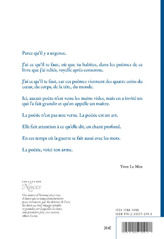 Les poètes rassemblés par Yvon Le Men annoncent que le temps du poème continuerait contre vents et marées, entre ombres et lumières Ce livre est la trace des soirées « Il fait un temps de poème », animées depuis plus de 30 ans par Yvon Le Men, et accueillies au Carré Magique de Lannion. Cette anthologie, (volume 3 de la série) rassemble aujourd’hui des contributions d’auteurs invités entre 2013 et 2023 tels que Katerina Apostolopoulou, Luc Baba, Terez Bardaine, Stéphane Bataillon, Jeanne Benameur, Seyhmus Dagtekin, Salah Al Hamdani, Cypris Kophidès, Aurélia Lassaque, Patrick Laupin, Ružica MiličeviÄ, Hala Mohammad, Maya Ombasic, Nathalie Papin, Paola Pigani, Thierry Renard, Dominique Sampiero, Faruk Sehic et Joël Vernet entre autres. Il s’agit de textes inédits pour la plupart. Chaque invité contribuant à ce recueil a invité une autre, un autre qui a compté dans sa vie, leur maître en poésie. « Tous les poèmes rassemblés ici ne m’émeuvent pas au même moment. Un jour, c’est l’un ; un jour, c’est l’autre. Cela dépend du temps qu’il fait dehors, dedans. Cela dépend de l’air du temps, du temps de poème qu’il fait entre moi et le poème que je reçois. Le lecteur, aussi, fait le poème. Et je suis, chaque jour, un lecteur différent. »