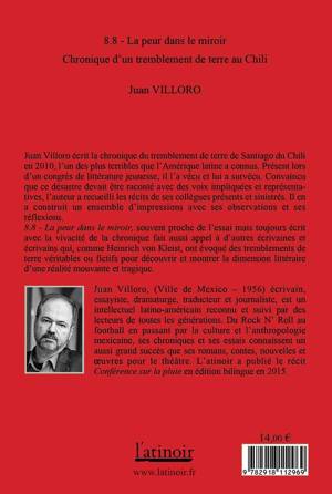Juan Villoro raconte comment il s'est retrouvé à comparer l'intensité de deux des plus terribles tremblements de terre qu'a connus l'Amérique latine : Mexico 1985 et Santiago du Chili 2010. Convaincu que ces désastres devaient être racontés avec des voix impliquées représentatives, l'auteur a recueilli des témoignages d'où ne sont absents ni le suspens ni l'absurde. Avec la narration chorale sur les distinctes tragédies de survie à l'effroi, 8.8 de magnitude. La Peur dans le miroir fait appel à l'essai et au récit, mais aussi au témoignage d'autres écrivains qui, comme Kleist, racontent des tremblements de terres véritables ou fictifs dans le but de découvrir les dimensions d'une réalité mouvante.