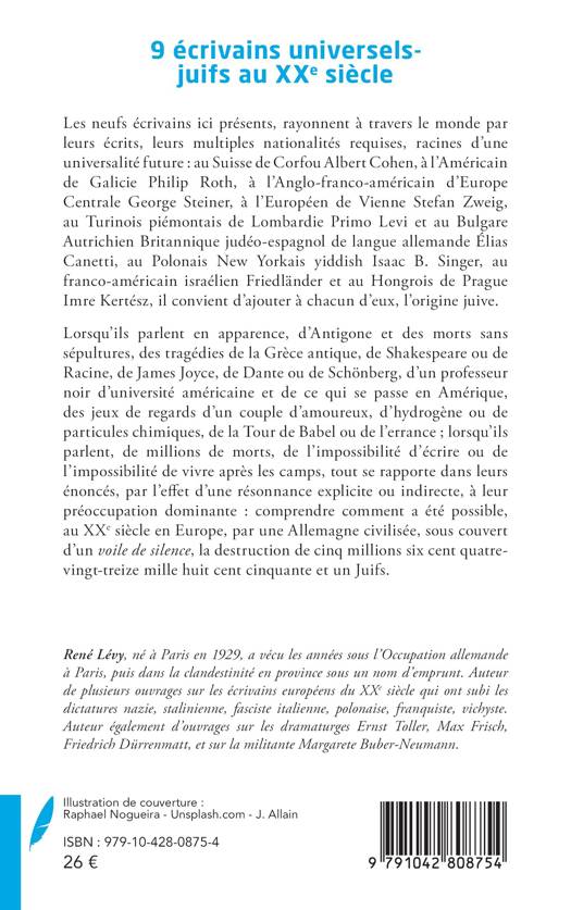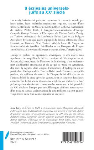 Les neufs écrivains ici présents, rayonnent à travers le monde par leurs écrits, leurs multiples nationalités requises, racines d'une universalité future au Suisse de Corfou Albert Cohen, à l'Américain de Galicie Philip Roth, à l'Anglo-franco-américain d'Europe Centrale George Steiner, à l'Européen de Vienne Stefan Zweig, au Turinois piémontais de Lombardie Primo Levi et au Bulgare Autrichien Britannique judéo-espagnol de langue allemande Élias Canetti, au Polonais New Yorkais yiddish Isaac B. Singer, au franco-américain israélien Friedländer et au Hongrois de Prague Imre Kertész, il convient d'ajouter à chacun d'eux, l'origine juive. Lorsqu'ils parlent en apparence, d'Antigone et des morts sans sépultures, des tragédies de la Grèce antique, de Shakespeare ou de Racine, de James Joyce, de Dante ou de Schönberg, d'un professeur noir d'université américaine et de ce qui se passe en Amérique, des jeux de regards d'un couple d'amoureux, d'hydrogène ou de particules chimiques, de la Tour de Babel ou de l'errance; lorsqu'ils parlent, de millions de morts, de l'impossibilité d'écrire ou de l'impossibilité de vivre après les camps, tout se rapporte dans leurs énoncés, par l'effet d'une résonnance explicite ou indirecte, à leur préoccupation dominante comprendre comment a été possible, au XXe siècle en Europe, par une Allemagne civilisée, sous couvert d'un voile de silence, la destruction de cinq millions six cent quatre-vingt-treize mille huit cent cinquante et un Juifs.